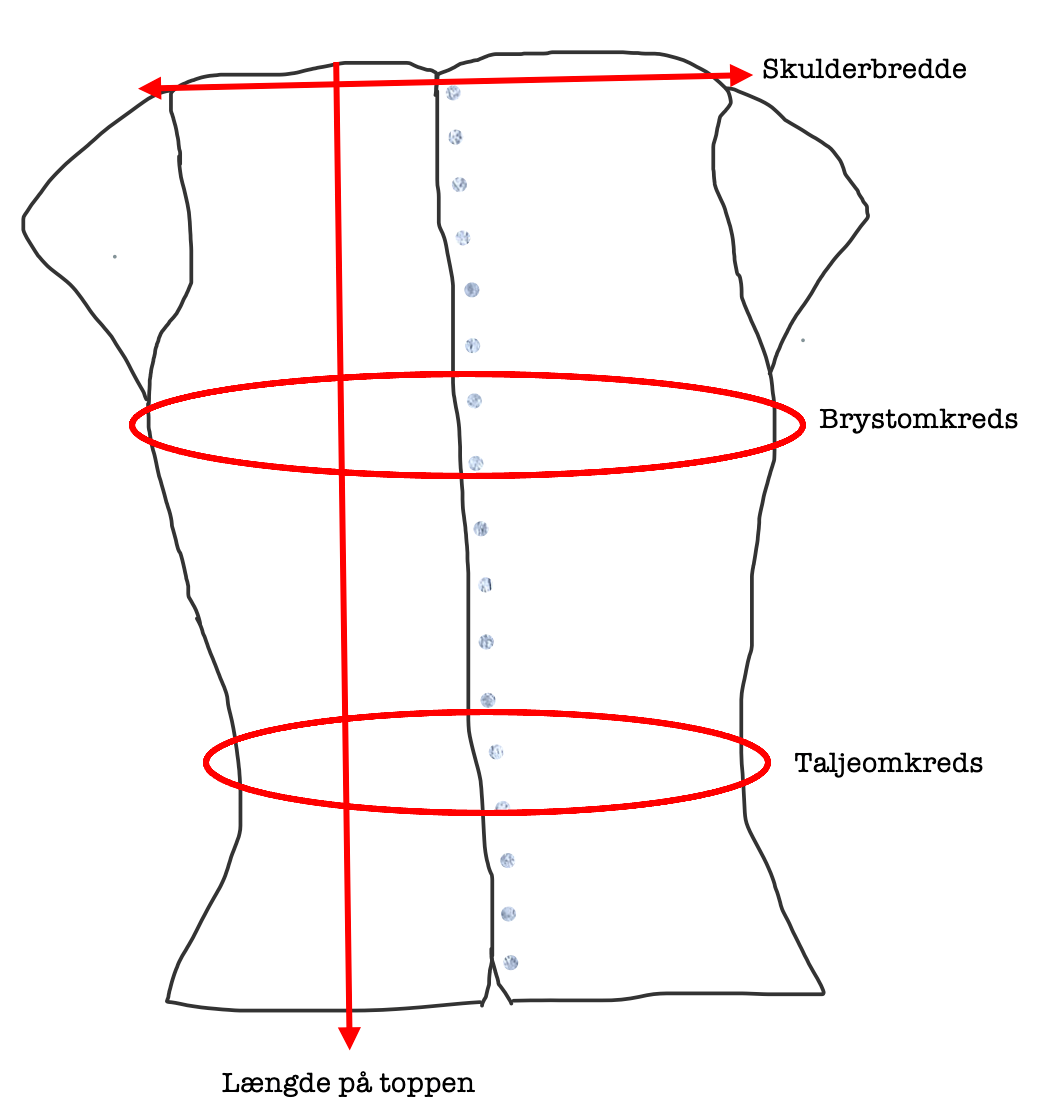 Brystomkreds (bredeste sted, målt på egen krop): (74-79) 80-84 (85-90) 91-95 (96-100) 101-105 (106-112) 113-119 (120-128) 129-137 cm